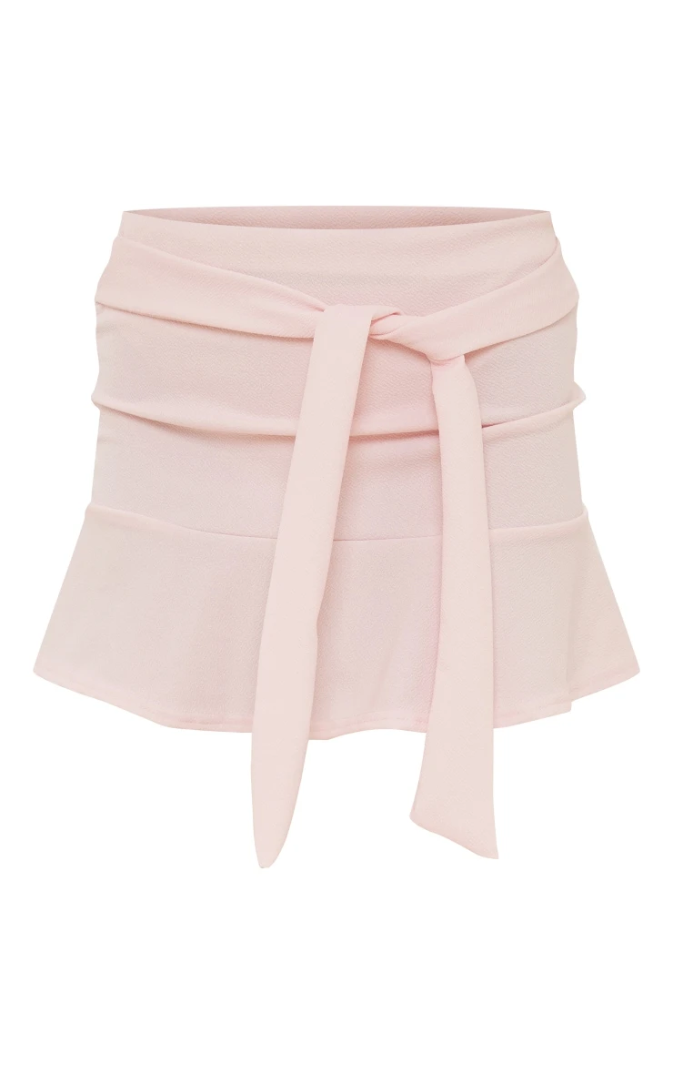 Get ready tio look pretty in pink in this baby pink crepe tie front frill hem mini skirt. Made from a dreamy baby pink hue crepe material with a frill hem design and a tie front to add that little extra detail, this skirt is sure to add some fiercely feminine vibes to your next weekend look. Style with a figure-flattering corset top, heels and a mini bag for a look that will have all eyes on you.