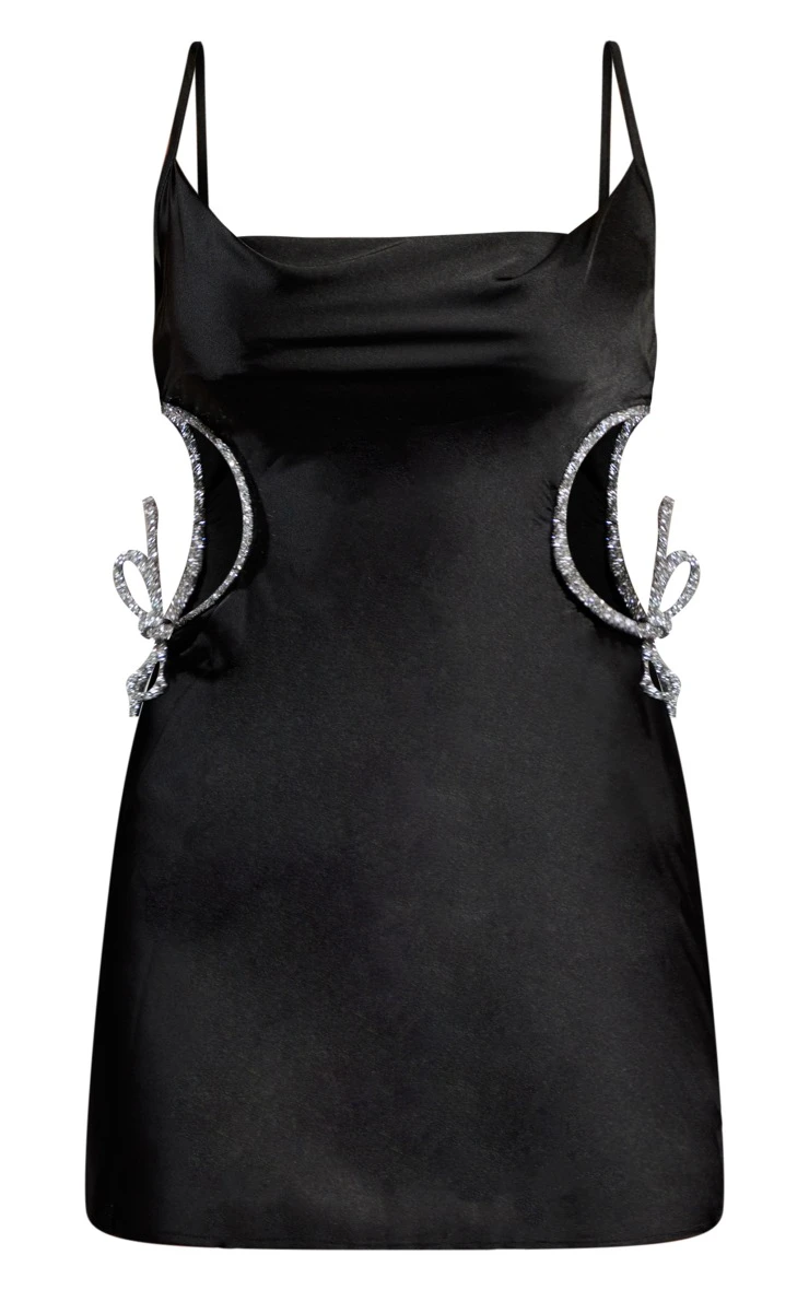 This dress is sure to be your new weekend go-to doll. Featuring a back glitter material with a bow detail, a cutout design and a flattering fit, we are in love. Wear with high heels, a statement bag and wear with confidence for your next social plan