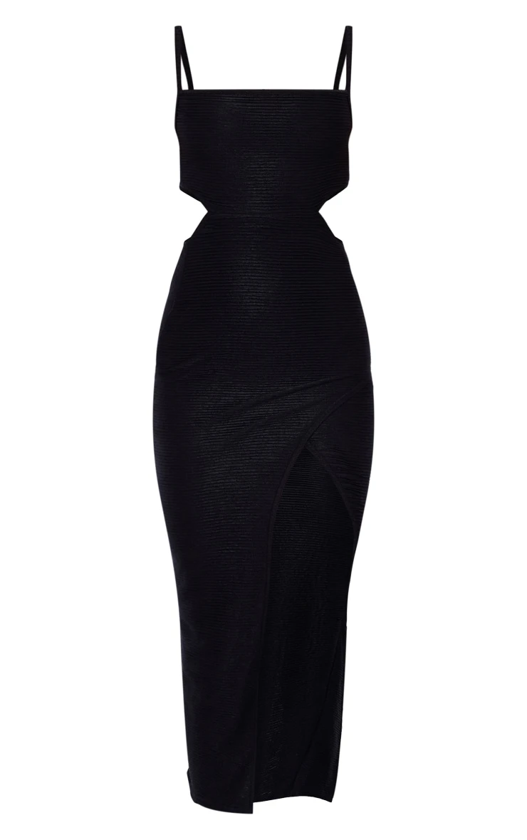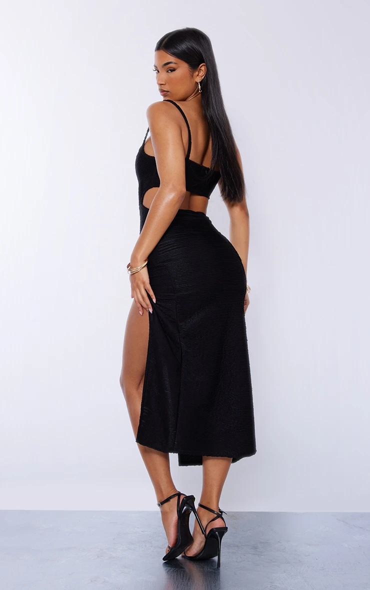 Look all kinds of glam in this dress. Featuring a black hue material with a pleated open back design and a midaxi length. Pair with some black heels and hoop earrings for a look we are obsessing over .