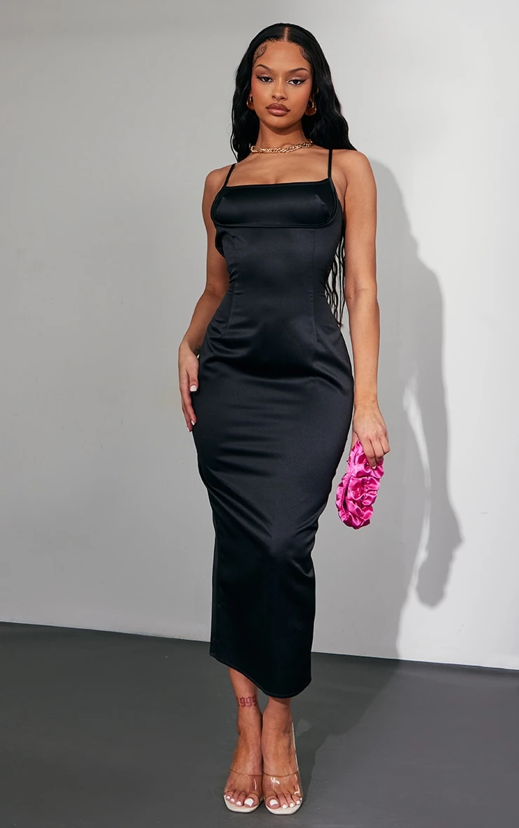 Hit refresh on your weekend wardrobe with this black satin contrast underbust detail midi dress. This dress with be sure to make heads turn at any occasion. With a black satin material, you will be feeling extra luxe this season. This dress has an underbust detail for a flattering fit, what’s not to love? Style with some clear heels, a statement back and accessories of your choice to complete the look everyone is loving.