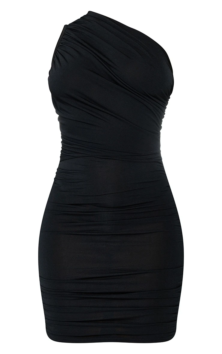 Elevate your weekend wardrobe with this dress doll. Featuring a black slinky material with a one shoulder neckline and ruched detailing, we’re in love. Just add heels and a statement bag to complete the look.