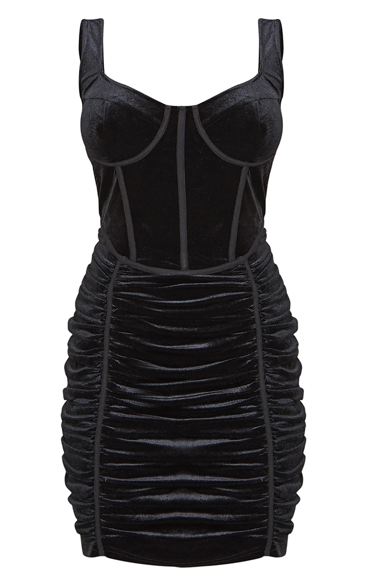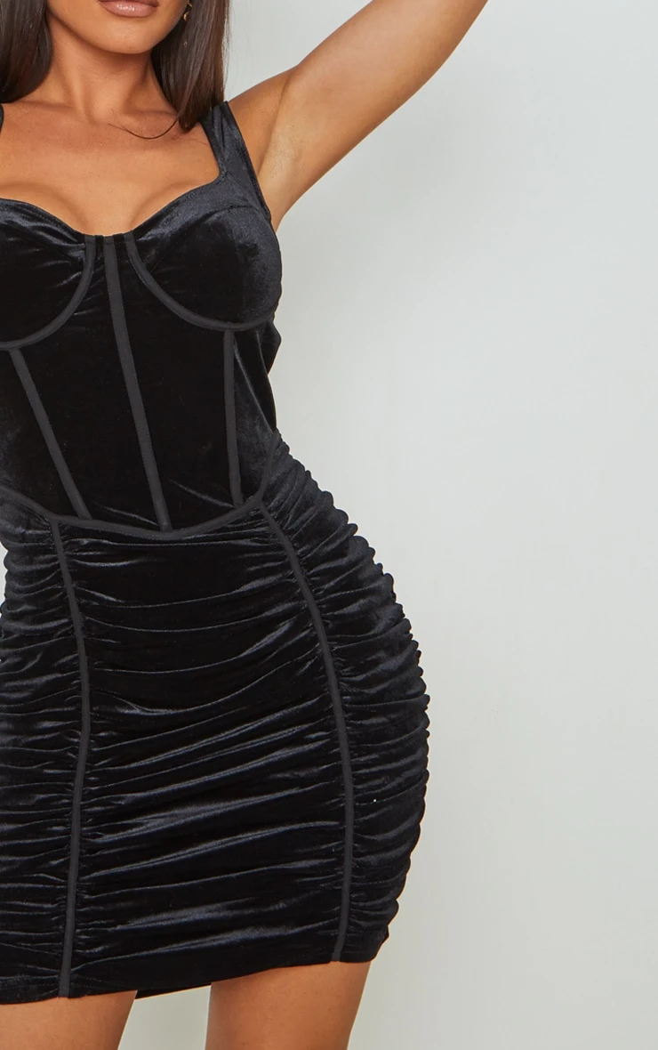 Update your LBD game with this dress doll. Featuring a black velvet material with a corset design, binding detail, a ruched style and a figure-worshipping fit. Team it with clear heels and a mini bag to keep it seriously chic.