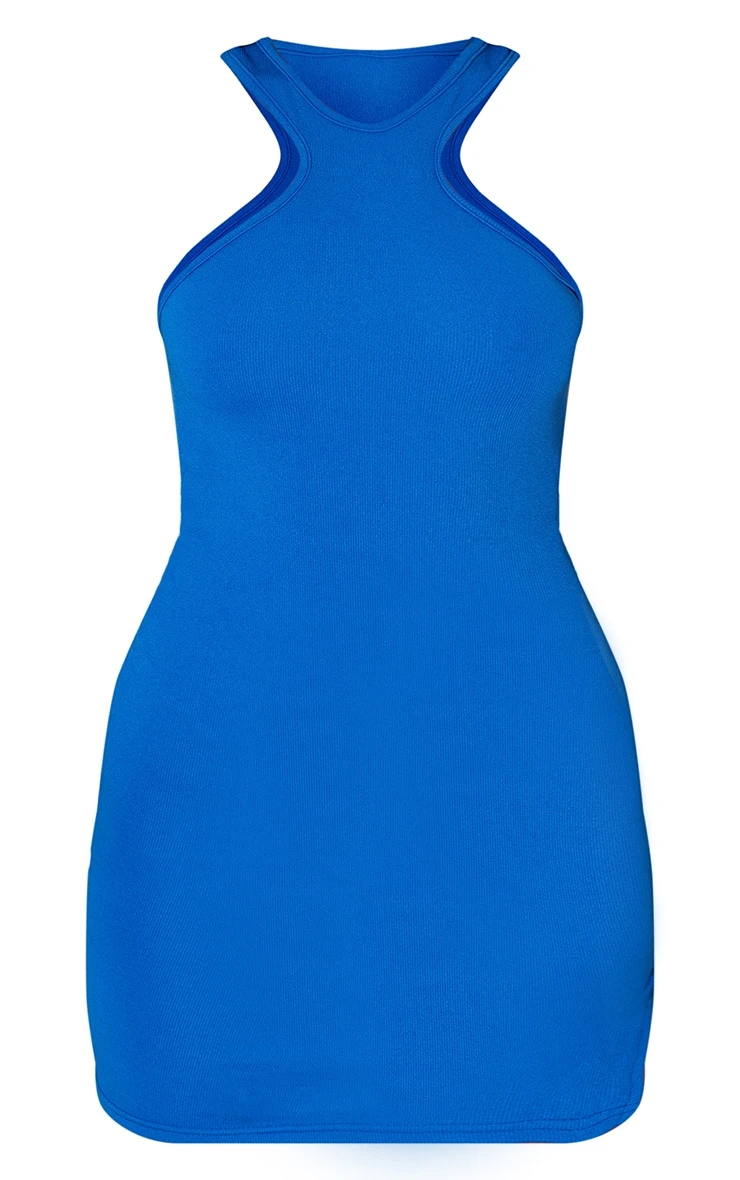Add some bold hues to your outfit of the day with this dress. Featuring a blue ribbed material with an extreme racer neck design and a bodycon fit. Team with knee high boots and a cropped jacket for a chic, off-duty combo.