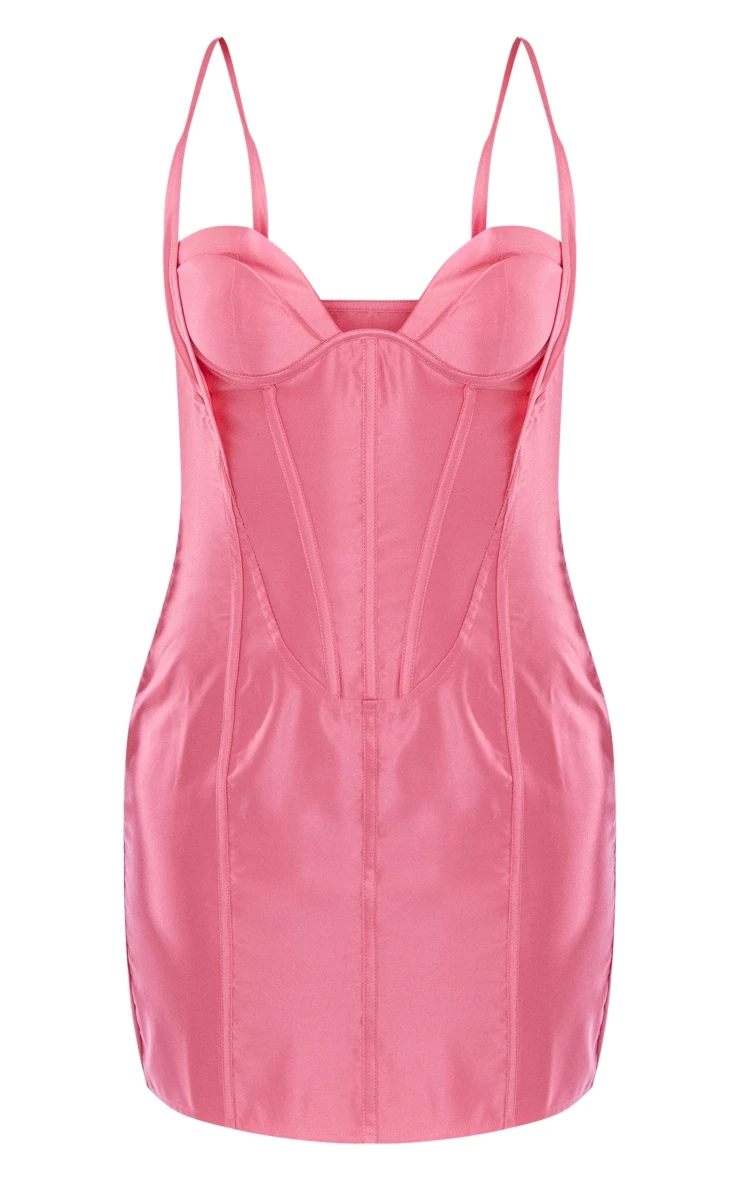 Get ready to have heads turning for all the right reasons with this bodycon dress. Featuring a bright pink satin material with a structured corset cup design and a zip fastening. Wear with pink heels and statement accessories to complete this fierce fit.