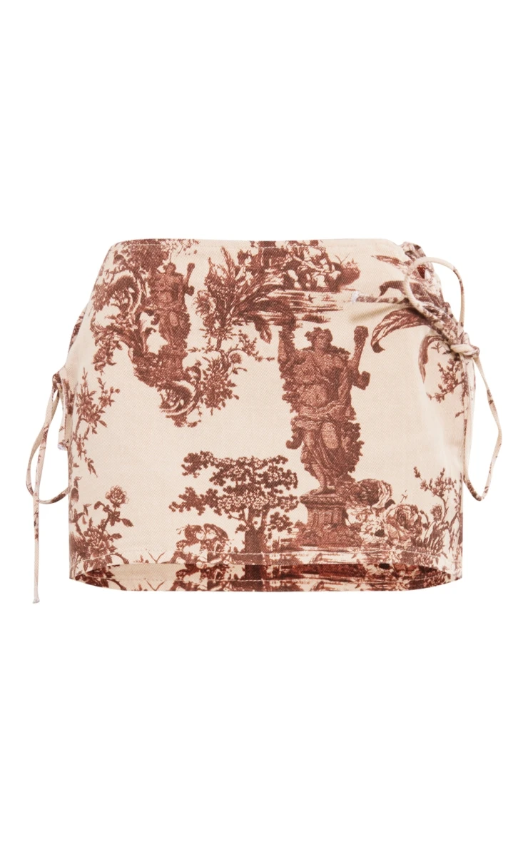This mini skirt is sure to be at the top of your new season hit list. Featuring a brown denim material with a renaissance inspired print and a lace up side design. Just add the matching top, an oversized jacket and heeled boots to earn all the style points.