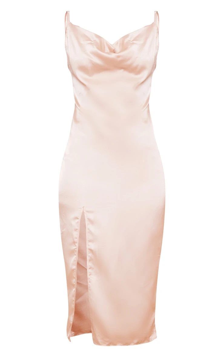 Get ready to make a statement in this show stopping cowl neck dress doll. Featuring a champagne satin material with a flattering cowl neckline, a midi length and a split in the leg, we just can’t get enough. In a stunning silky material that is sure to have all eyes on you, this side split midi dress is a must-have for the new season, We are loving this strappy satin dress styled with clear strappy heels and some layered necklaces for a look that is perfect for any occasion.