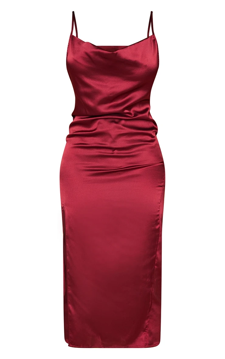 This dress is giving us all the glam vibes doll. Featuring a burgundy satin fabric with a cowl neckline, thin straps and midi length, what’s not to love? Style with barely-there heels for a look we’re loving.
