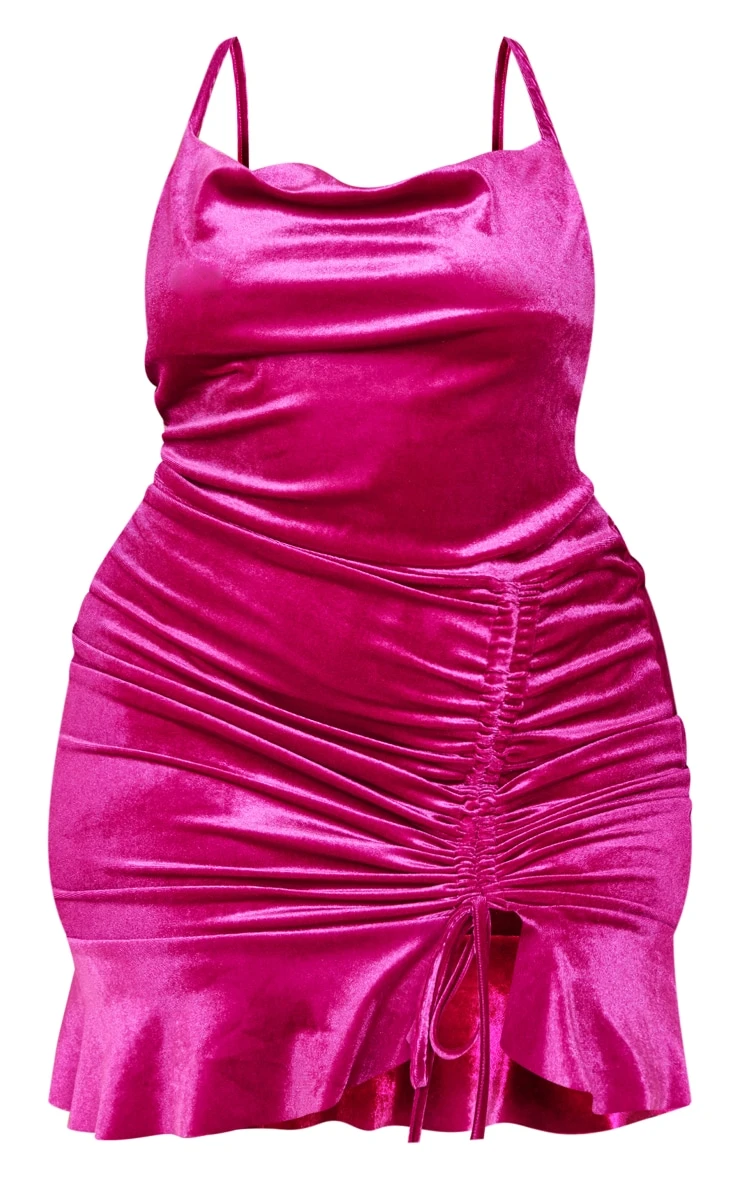 Get occasion ready with this statement dress doll. Featuring a fuchsia hue velvet material with a frill hem design, ruched detail and a bodycon fit. Style with heels and a mini bag for a look that will have all eyes on you.