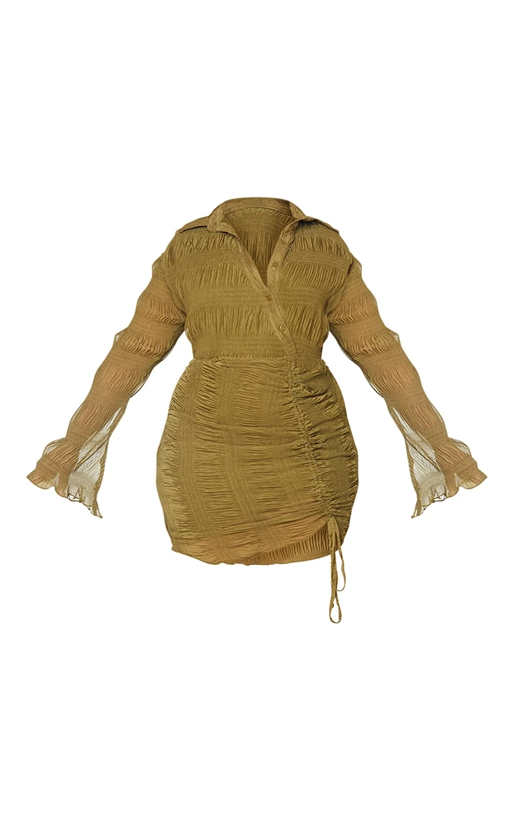 A shirt dress is always an essential and we are obsessed with this one. Featuring an olive textured plisse material with ruched detailing and a button-up design, what’s not to love? Team with barely-there heels and gold accessories to finish the look.