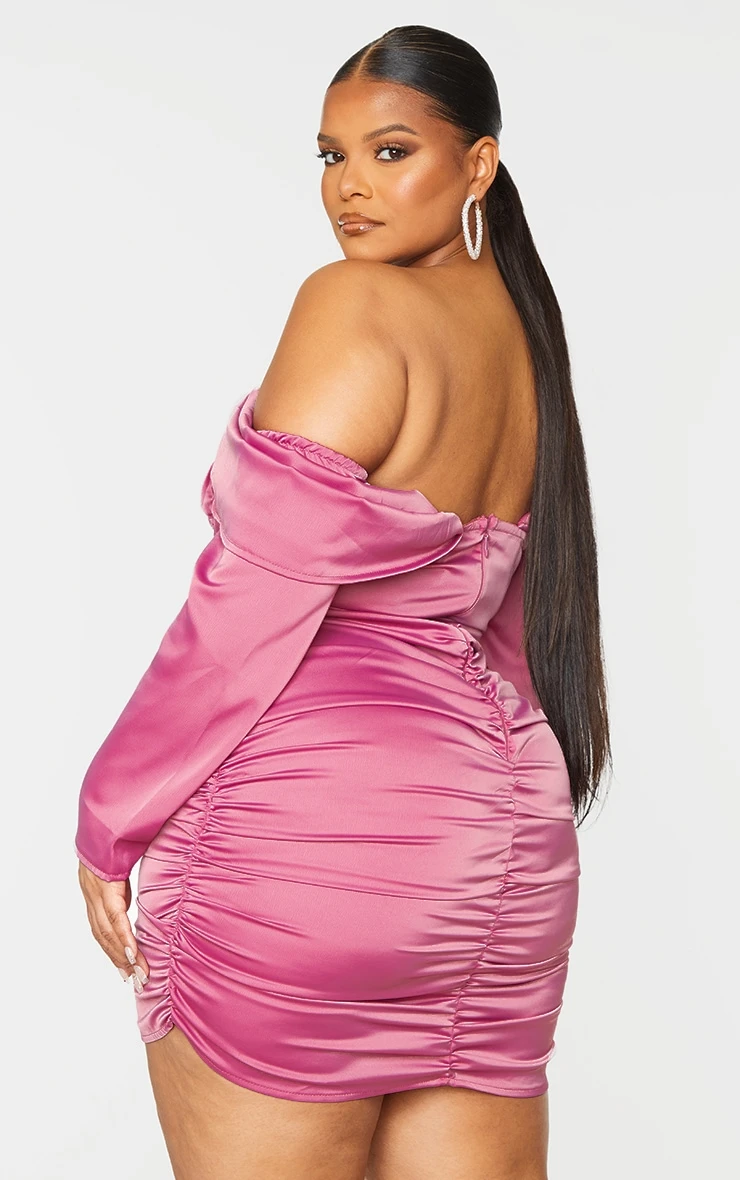 Have all eyes on you in this unreal dress doll. Featuring a pink satin material with a bardot neckline and ruched back, we’re in love. Style with statement heels and hoop earrings for a night with the dolls.