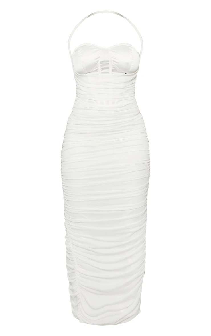 Show off your shape this season in this shape white mesh corset detail ruched maxi dress. This unreal dress is brought to you in a white mesh material for a flattering fit, and a corset detail that will have you feeling confident. With a ruched detail and a maxi length, you’ll be centre of attention wherever you go. Simply style with your fave accessories and gold mule heels to complete the look we are loving.