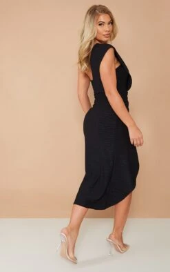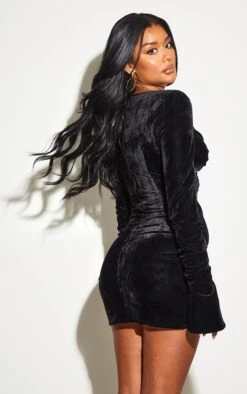 Black Velvet Twisted Cut Out Detail Ruched Sleeve Bodycon Dress
