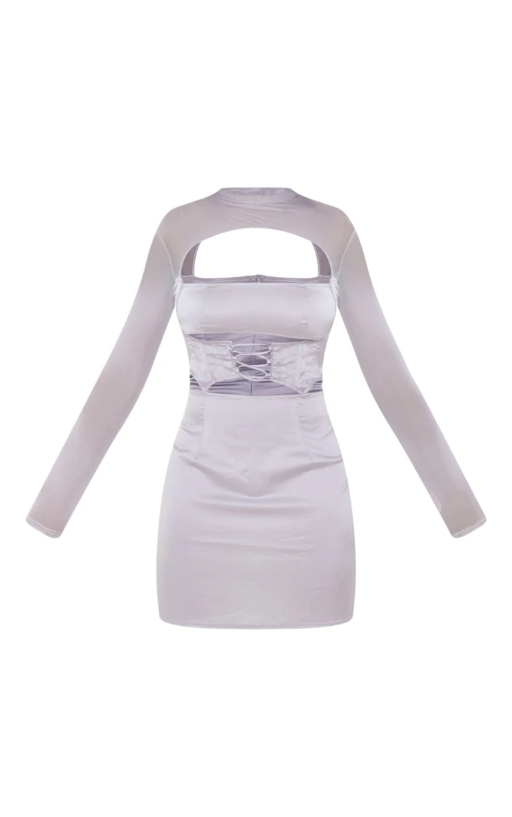 Stand out from the crowd in this show stopping silver satin lace up corset mesh sleeve bodycon dress. In a luxe silver satin material with a chic lace up corset design and a figure-flattering bodycon ‘fit, this dress is sure to get people talking doll. Style this bodycon dress with strappy heels and accessories for a look that will have heads turning on your next night out with the dolls.