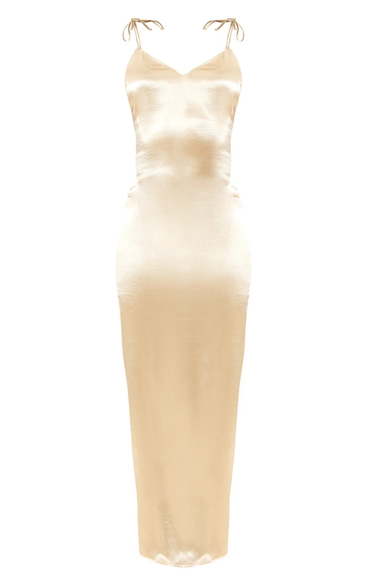 Glam up your weekend look with this champagne satin maxi dress. Its champagne satin material is that touch of luxe you have been searching for doll and is sure to steal all the stares. This tall maxi dress has a strappy design with a split hem and figure-hugging fit, it is perfect for that upcoming special occasion. Simply add clear heels, a shoulder bag and gold accessories for a flawless finish.