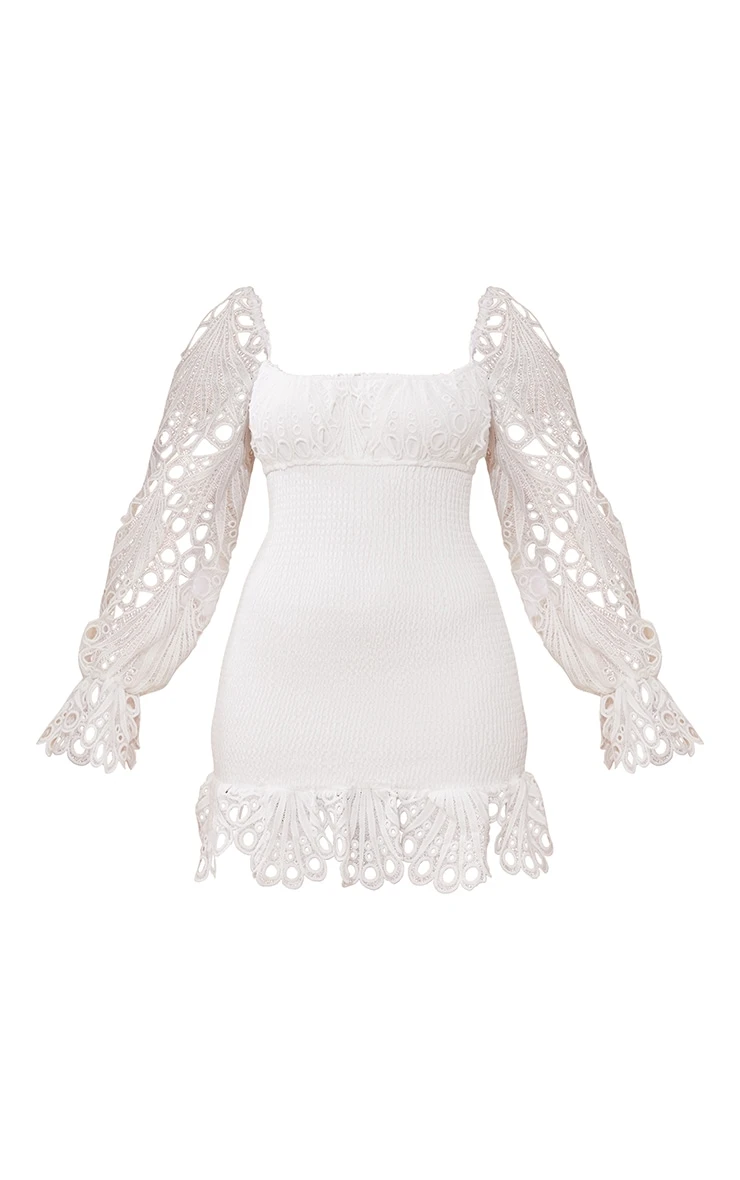 Add a new little white dress to your look with this bodycon dress. Featuring a white shirred material with lace sleeves and a bodycon fit, style this with strappy clear heels and complete the look with a cute clutch bag.
