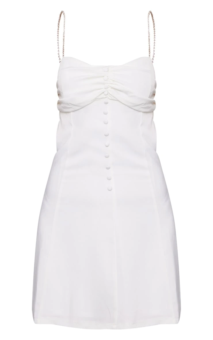 Channel some glam vibes this weekend with this bodycon dress. Featuring a white satin material with diamante straps and button detailing. Simply style it with a blazer, heeled boots and a statement bag for a look that will turn heads.