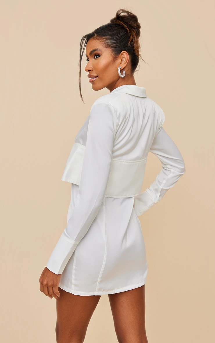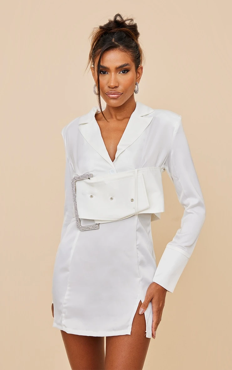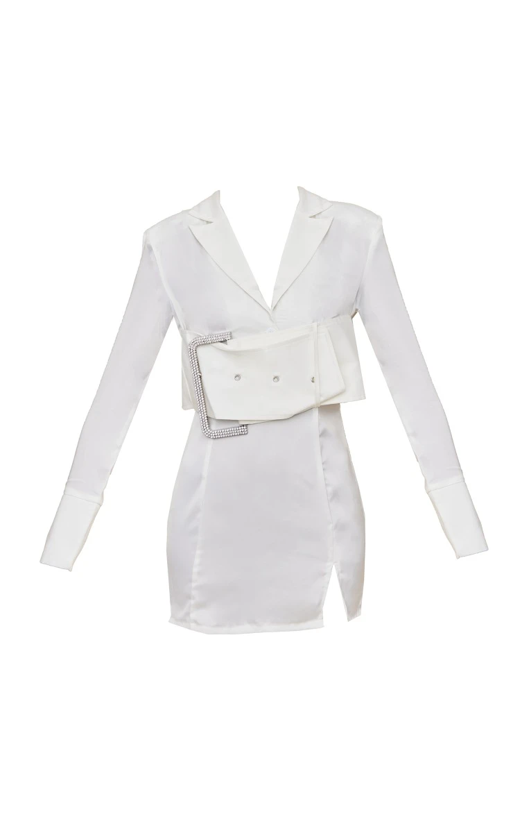 Look the best dressed for any occasion with this blazer dress doll. Featuring a white satin material with an extreme buckle design and a figure-hugging fit. Keep this look super glam with clear heels and a metallic bag.