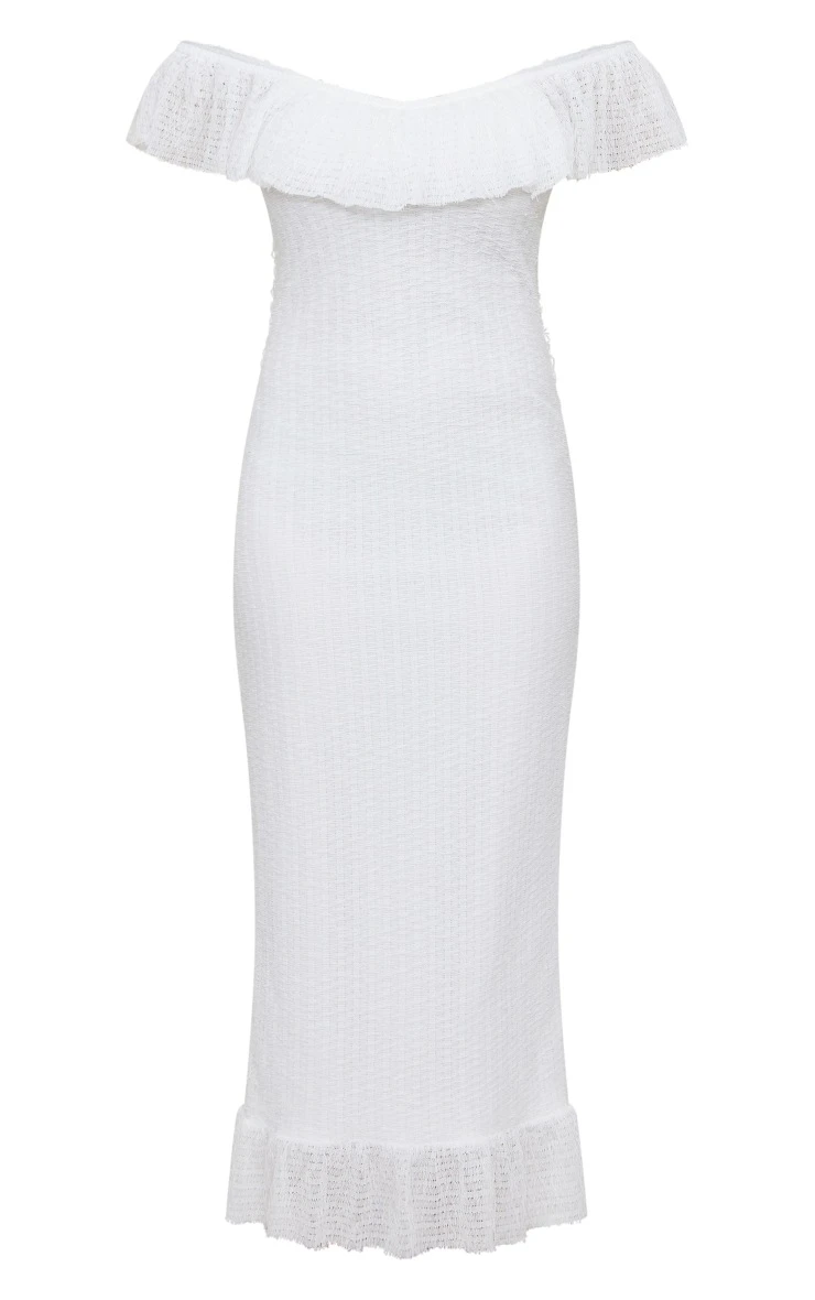 This white textured bardot frill detail midaxi dress is sure to add some chic vibes to your wardrobe with a white textured material and a bardot design, you will feel confident whatever the occasion. With a frill detail, this midaxi dress is perfect for those important plans in your diary. Team with some comfy sandals and your fave accessories to complete the look we are loving.