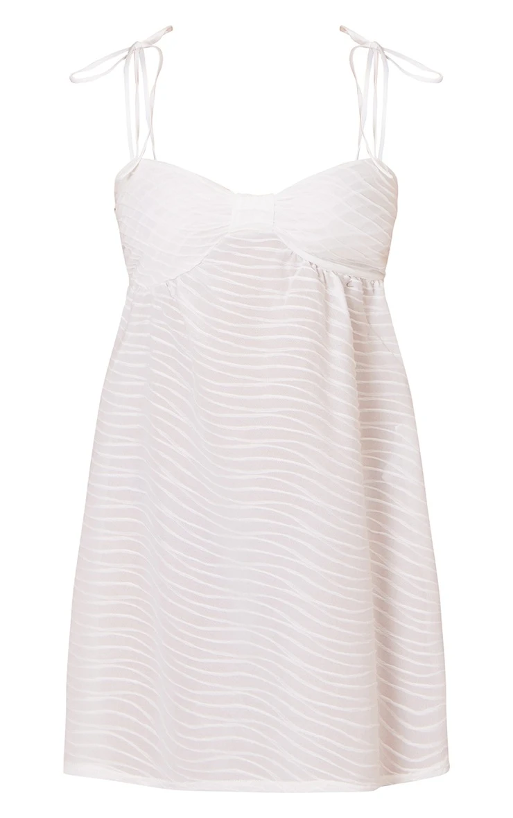 This dress is the perfect piece for levelling up your new season wardrobe. Featuring a white textured material with a bow detail, tie strap and shift design, what’s not to love? Wear with gold accessories and slides to be sure you are the best dressed.